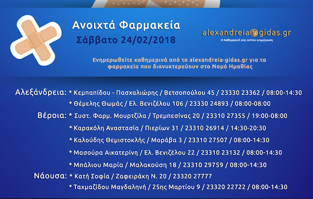 ΤΟΠΙΚΑ 24 Φεβρουαρίου, 2018 posted by admin Share Ανοιχτά φαρμακεία Ημαθίας Σάββατο 24 Φεβρουαρίου Αλεξάνδρεια: Αφήστε μια απάντηση Ακύρωση απάντησηςΗ ηλ. διεύθυνση σας δεν δημοσιεύεται. Τα υποχρεωτικά πεδία σημειώνονται με *Σχόλιο * Όνομα Email Ιστότοπος Αποθήκευσε το όνομά μου, email, και τον ιστότοπο μου σε αυτόν τον πλοηγό για την επόμενη φορά που θα σχολιάσω.