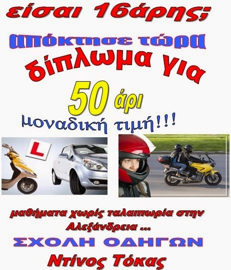 Φίλες και φίλοι, η Σχολή Οδηγών Ντίνος Τόκας σας ενημερώνει ότι, όσοι έχουν δίπλωμα (από παλιά) για 50άρι, που εκδόθηκε από την τροχαία, πρέπει να προβούν ΑΜΕΣΑ σε: