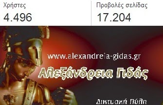 Κατά τη διάρκεια της Δευτέρας 21 Ιουλίου, η Δικτυακή Πύλη Αλεξάνδρεια-Γιδάς διαβάστηκε 17.204 φορές. Οι μοναδικοί χρήστες (routers) που μας επισκέφτηκαν ήταν 4.496!