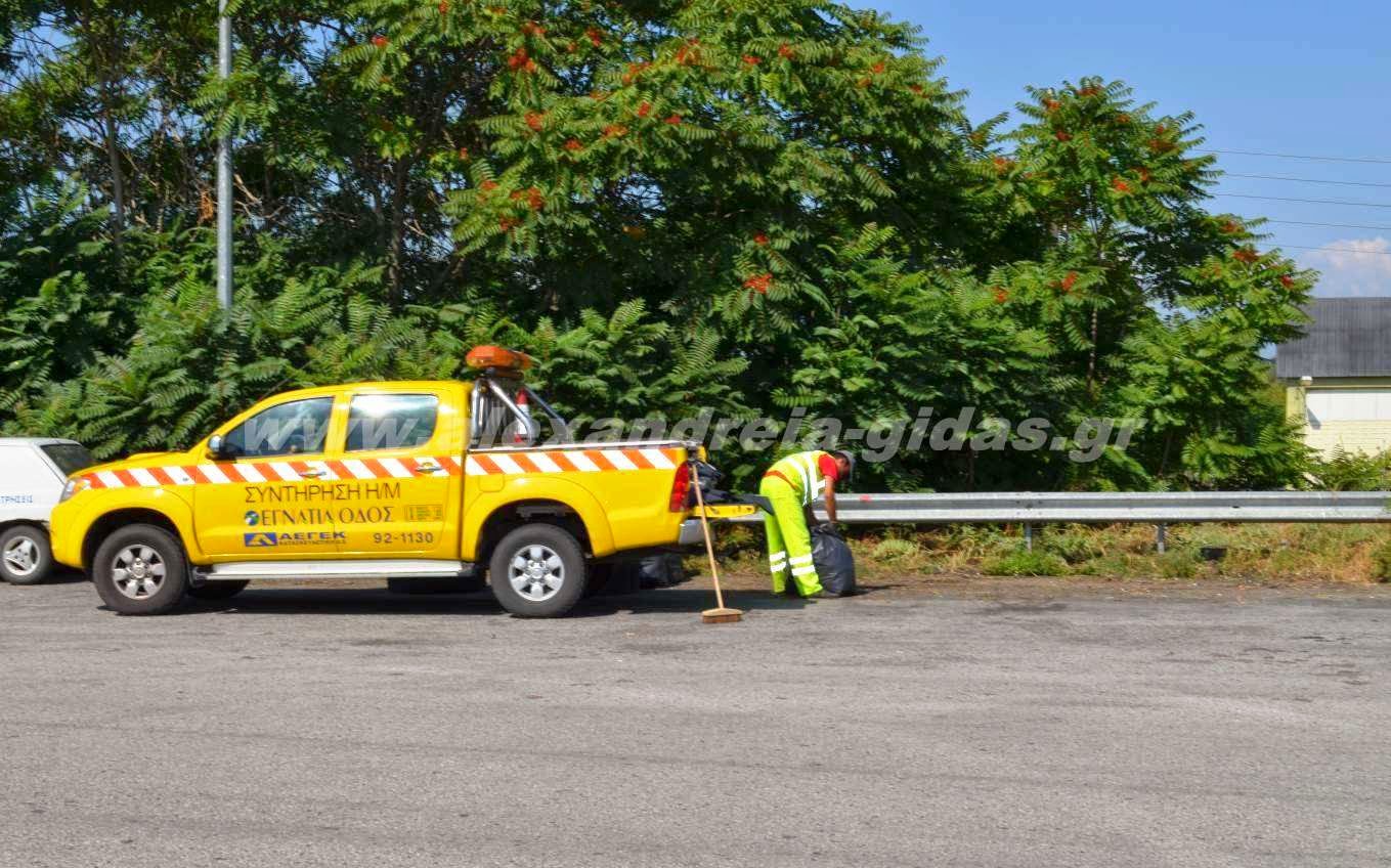 Τους υπαλλήλους της Εγνατίας Οδού είδαμε το πρωί της Πέμπτης να καθαρίζουν τα σκουπίδια στον χώρο του κόμβου Νησελίου.