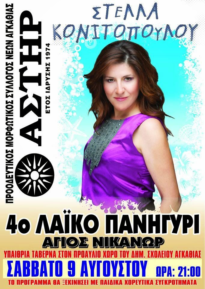 Ο Προοδευτικός Μορφωτικός Σύλλογος Νέων Αγκαθιάς “Ο ΑΣΤΗΡ” σας προσκαλεί στις 9 Αυγούστου στο προαύλιο του Δημοτικού Σχολείου Αγκαθιάς σε νησιώτικο, παραδοσιακό και λαϊκό πρόγραμμα με τη Στέλλα Κονιτοπούλου!
