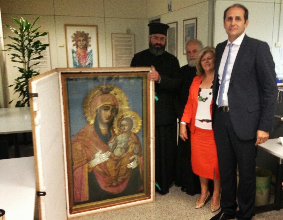 vesyeikonaΤην εικόνα της Παναγίας Αγιοταφίτισσας, του κεντρικού Μοναστηριού Αγίων Κωνσταντίνου και Ελένης του Πατριαρχείου Ιεροσολύμων, που θα τεθεί για προσκύνηση στον Ιερό Ναό Κοιμήσεως της Θεοτόκου της Αλεξάνδρειας, υποδέχτηκε ο Βουλευτής Ημαθίας της Νέας Δημοκρατίας, Απόστολος Βεσυρόπουλος κατά την άφιξη της στο Αεροδρόμιο Ελ. Βενιζέλος.
