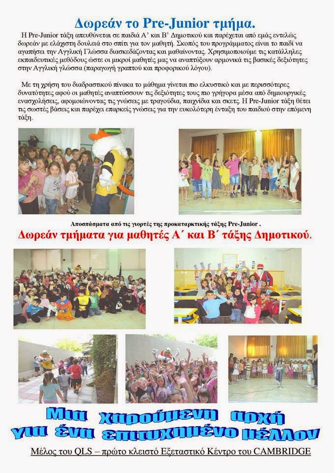 Αύριο, Παρασκευή 5/9 στις 7.00 μ.μ. σας περιμένουμε στο πρώτο μάθημα των τμημάτων Pre-Junior για μαθητές Α & Β τάξης Δημοτικού. Το μάθημα είναι δοκιμαστικό και δεν έχετε καμία απολύτως δέσμευση για τα επόμενα, απλά μπορείτε να έρθετε και να δείτε τη δουλειά μας!