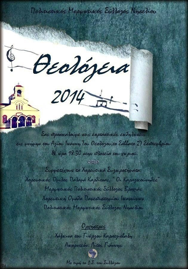 O Πολιτιστικός Μορφωτικός Σύλλογος Νησελίου σας προσκαλεί στις εορταστικές εκδηλώσεις Θεολόγεια 2014 στη μνήμη του Αγίου Ιωάννη Του Θεολόγου, το Σάββατο 27 Σεπτεμβρίου στις 18:30 στην πλατεία του χωριού.
