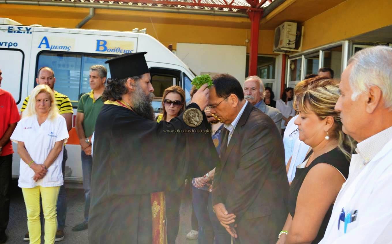 Τον αγιασμό πραγματοποίησε ο Πατήρ Θεόδωρος ενώ μίλησαν κατά τη διάρκεια της παραλαβής ο Διευθυντής του Κέντρου Υγείας Αλεξάνδρειας Αστέριος Καρούλιας, η Διευθύντρια του Νοσοκομείου Βέροιας Αναστασία Μπούρτσου, ο Υποδιοικητής της 3ης Υγειονομικής Περιφέρειας Ημαθίας Παναγιώτης Νάνος και ο πρόεδρος της ΚΕΔΑ Στέφανος Δελιόπουλος.