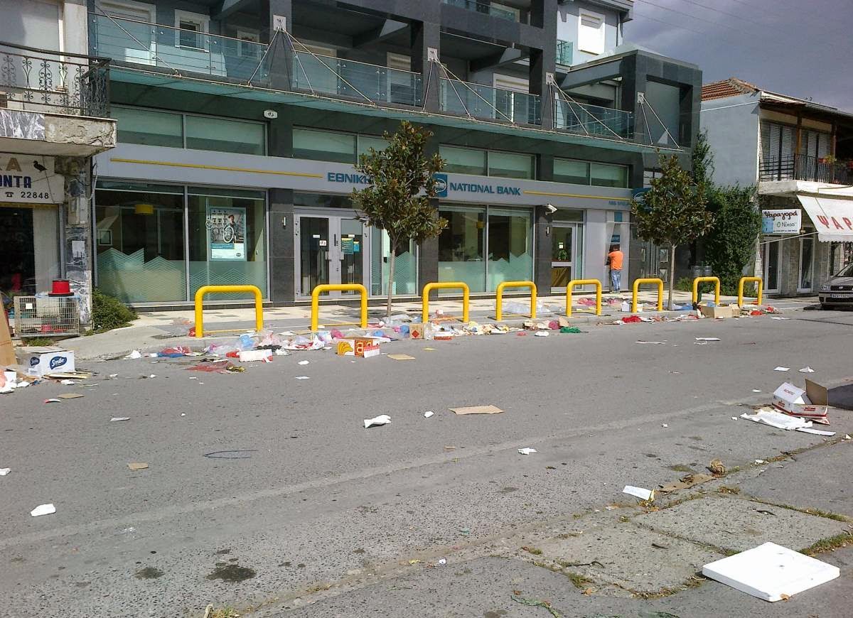 Το παζάρι τελείωσε, οι παζαρτζίδες (έμποροι λαϊκών αγορών) μάζεψαν τους πάγκους τους, πήραν τα χρήματα των δημοτών μας, και μας άφησαν τα σκουπίδια τους!!! Οι εργάτες καθαριότητας επί τρεις ώρες προσπαθούσαν με τον αέρα που φυσούσε να συμμαζέψουν την κατάσταση, και παρά τις φιλότιμες προσπάθειές τους η είσοδος της πόλης για το Σαββατοκύριακο δεν θα είναι και η καλύτερη μιας και ο αέρας που φυσούσε σκόρπισε σε μεγάλη απόσταση τα σκουπίδια. Οι έμποροι λαϊκών αγορών θεωρούν ότι επειδή ο Δήμος εισπράττει από αυτούς 5-6 ευρώ για το χώρο που καταλαμβάνουν είναι υποχρεωμένος να καθαρίζει τα δικά τους σκουπίδια.