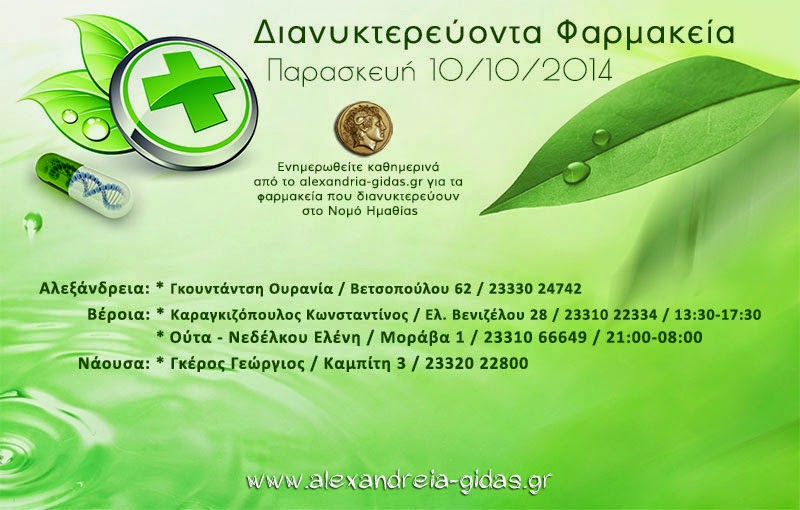 ΤΟΠΙΚΑ 10 Οκτωβρίου, 2014 posted by admin Share Εφημερεύοντα – διανυκτερεύοντα φαρμακεία Ημαθίας Παρασκευή 10/10 Αλεξάνδρεια: Αφήστε μια απάντηση Ακύρωση απάντησηςΗ ηλ. διεύθυνση σας δεν δημοσιεύεται. Τα υποχρεωτικά πεδία σημειώνονται με *Σχόλιο * Όνομα Email Ιστότοπος Αποθήκευσε το όνομά μου, email, και τον ιστότοπο μου σε αυτόν τον πλοηγό για την επόμενη φορά που θα σχολιάσω.