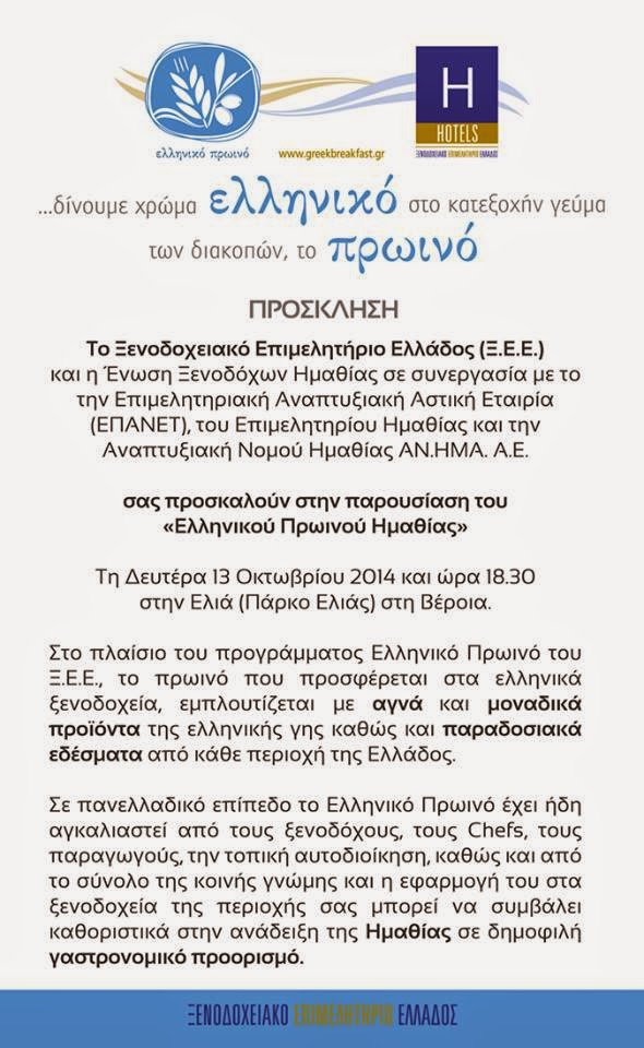 Το Ξενοδοχειακό Επιμελητήριο Ελλάδας (Ξ.Ε.Ε.) και η Ένωση Ξενοδόχων Ημαθίας σε συνεργασία με την Επιμελητηριακή Αναπτυξιακή Αστική Εταιρία (ΕΠΑΝΕΤ), του Επιμελητηρίου Ημαθίας και την Αναπτυξιακή Νομού Ημαθίας ΑΝ.ΗΜΑ. Α.Ε. σας προσκαλούν στην παρουσίαση του “Ελληνικού Πρωινού Ημαθίας” τη Δευτέρα 13 Οκτωβρίου 2014 και ώρα 18:30 στην Ελιά (Πάρκο Ελιάς) στη Βέροια.