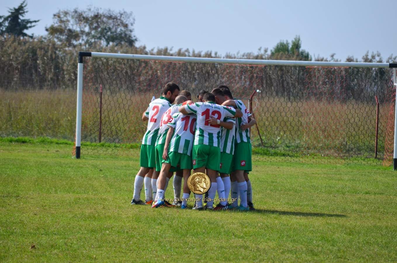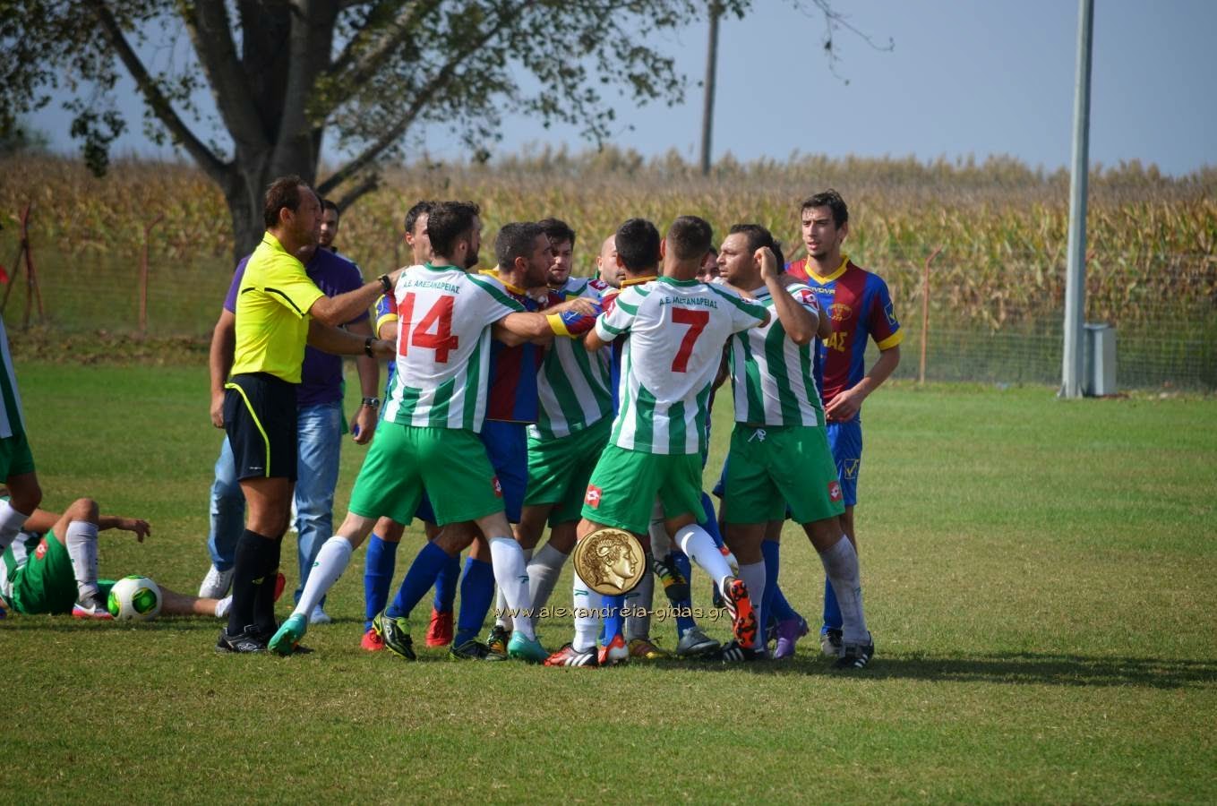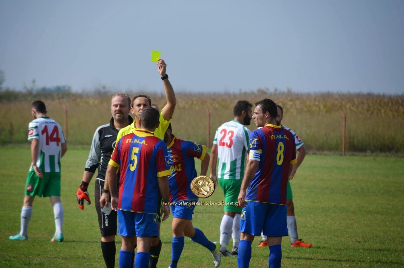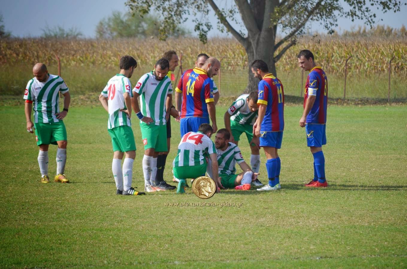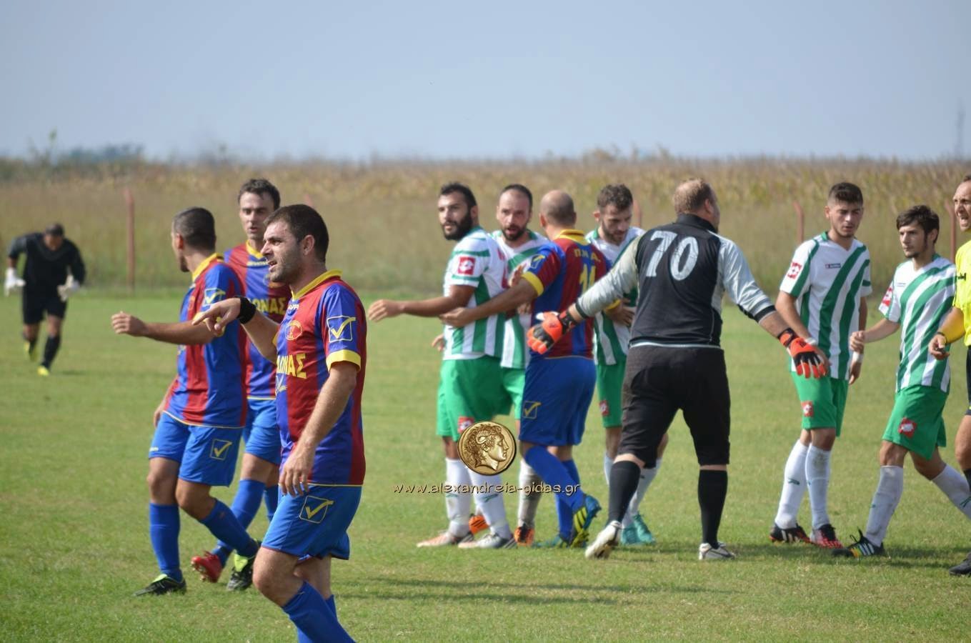 Οι γηπεδούχοι άνοιξαν το σκορ στο 8΄ με απευθείας φάουλ του Δερμιτζόγλου έξω από την μεγάλη περιοχή της Αλεξάνδρειας και κακή αντίδραση του Καρασαββίδη (1-0). Στο 29΄ οι γηπεδούχοι θα μείνουν με 10 ποδοσφαιριστές όταν ο Μελεσσίδης θα αποβληθεί με απευθείας κόκκινη κάρτα για αντιαθλητικό μαρκάρισμα στον Αποστολόπουλο. Στο επόμενο λεπτό ο Κίτσας ισοφάρισε για την Αλεξάνδρεια όταν έγινε κάτοχος της μπάλας ύστερα από κόντρες (1-1).