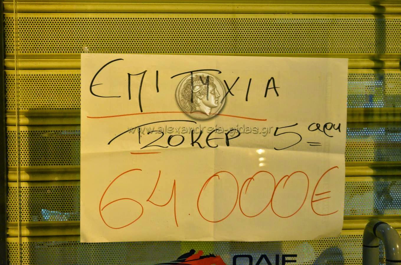 Το δελτίο παίχτηκε στο πρακτορείο ΟΠΑΠ Ο ΓΙΓΑΣ στην Αλεξάνδρεια και όπως μας είπε ο ιδιοκτήτης ήταν ένα απλό δελτίο χωρίς σύστημα. Με στήλη λοιπόν η οποία κοστίζει μισό ευρώ ένας τυχερός από την Αλεξάνδρεια κέρδισε 64.000 ευρώ πιάνοντας 5 αριθμούς χωρίς να πιάσει τον αριθμό τζόκερ.