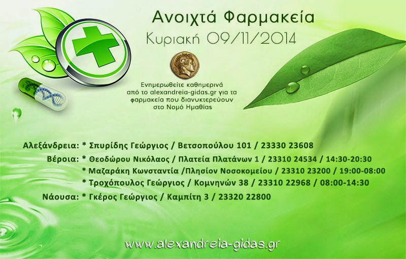 ΤΟΠΙΚΑ 9 Νοεμβρίου, 2014 posted by admin Share Ανοιχτά φαρμακεία Ημαθίας Κυριακή 09/11 Αλεξάνδρεια: Αφήστε μια απάντηση Ακύρωση απάντησηςΗ ηλ. διεύθυνση σας δεν δημοσιεύεται. Τα υποχρεωτικά πεδία σημειώνονται με *Σχόλιο * Όνομα Email Ιστότοπος Αποθήκευσε το όνομά μου, email, και τον ιστότοπο μου σε αυτόν τον πλοηγό για την επόμενη φορά που θα σχολιάσω.