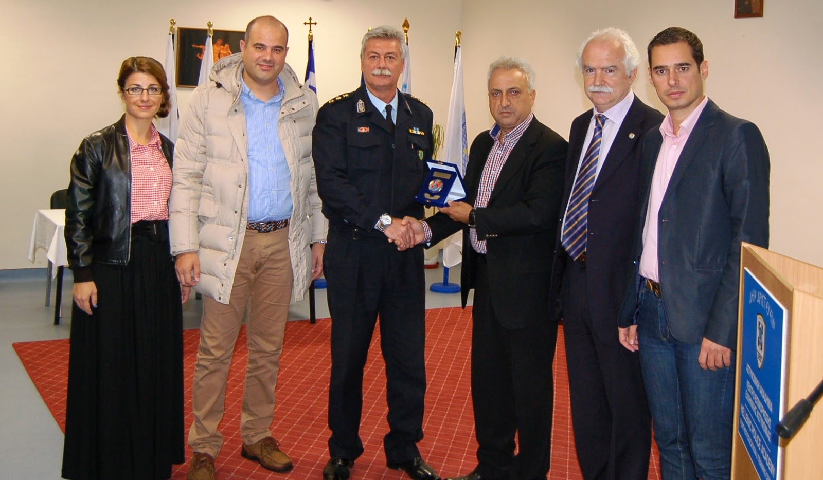 Στη συνέχεια επισκέφθηκαν τη Σχολή Μετεκπαίδευσης και Επιμόρφωσης Βόρειας Ελλάδας και συναντήθηκαν με το Διοικητή της Σχολής Αστυνομικό Υποδιευθυντή ΚΟΥΓΚΑ Διονύσιο, όπου τους ξενάγησε στις εγκαταστάσεις της Σχολής και τους ενημέρωσε για τη λειτουργία της. Στην αίθουσα δεξιώσεων πραγματοποιήθηκε ενημέρωση τόσο των σπουδαστών της Σχολής όσο και των μελών της Τοπικής Διοίκησης Ημαθίας για τους σκοπούς και την προσφορά της Δ.Ε.Α. από τον Πρόεδρο κ. ΚΑΡΑΠΑΤΑΚΗ Ιωάννη και την προσφορά αλληλεγγύης και τις παροχές του Ταμείου Επαγγελματικής Ασφάλισης Ε.Τ.Δ.Ε.Α.Π.Λ. προς τον συνάδελφο και την οικογένειά του από τον Πρόεδρο του Ταμείου κ. ΜΑΡΟΥΝΤΑ Νικόλαο. Ιδιαίτερη έμφαση δόθηκε στην πρόσφατη εκδήλωση διεθνούς προβολής που πραγματοποιήθηκε πρόσφατα στο Ηράκλειο από 01 έως 05 Οκτωβρίου 2014, την 1η Παγκόσμια Συνδιάσκεψη Γυναικών Αστυνομικών μελών Ι.Ρ.Α. και στις δράσεις που σχεδιάζονται στο εγγύς μέλλον, όπως το Παγκόσμιο Ολυμπιακό Συμπόσιο μελών Ι.Ρ.Α., που θεσμοθετήθηκε επίσημα κατά τις εργασίες του Παγκοσμίου Συνεδρίου της Γερμανίας και θα πραγματοποιείται ανά τετραετία κατά τη διάρκεια των εκδηλώσεων αφής της Ολυμπιακής Φλόγας. Με τη λήξη της προαναφερόμενης ενημέρωσης ο Πρόεδρος του Ταμείου Επαγγελματικής Ασφάλισης κ. ΜΑΡΟΥΝΤΑΣ Νικόλαος πρόσφερε τιμητική πλακέτα στο Διοικητή της Σχολής.