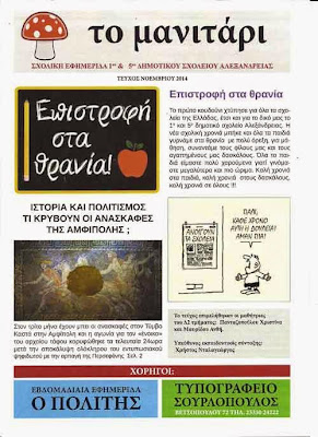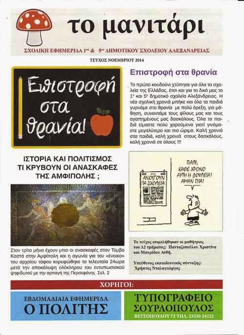 Κυκλοφόρησε το φύλλο Νοεμβρίου της σχολικής εφημερίδας «το μανιτάρι» που εκδίδουν το 1ο και το 5ο Δημοτικά Σχολεία Αλεξάνδρειας.
