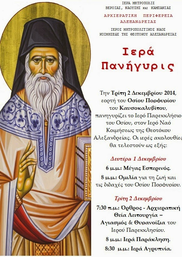 Την Τρίτη 2 Δεκεμβρίου 2014 εορτάζεται η μνήμη του Οσίου Πατρός ημών Πορφυρίου του Καυσοκαλυβίτου. Πρόκειται για έναν από τους νεώτερους ανακηρυγμένους Αγίους της Ορθοδόξου Εκκλησίας μας και έναν κατά γενική ομολογία από τους πλέον χαρισματικούς γέροντες της εποχής μας, με θαυμαστή ζωή, διδασκαλία και πλήθος θαυμάτων. Στην Ιερά Μητρόπολή μας η μνήμη του θα τιμηθεί για πρώτη φορά στον Ιερό Μητροπολιτικό Ναό Κοιμήσεως της Θεοτόκου Αλεξανδρείας, όπου πρόσφατα δημιουργήθηκε Ιερό Παρεκκλήσιο προς τιμήν του Οσίου, από τα λίγα που υπάρχουν ακόμα στην Ελλάδα.