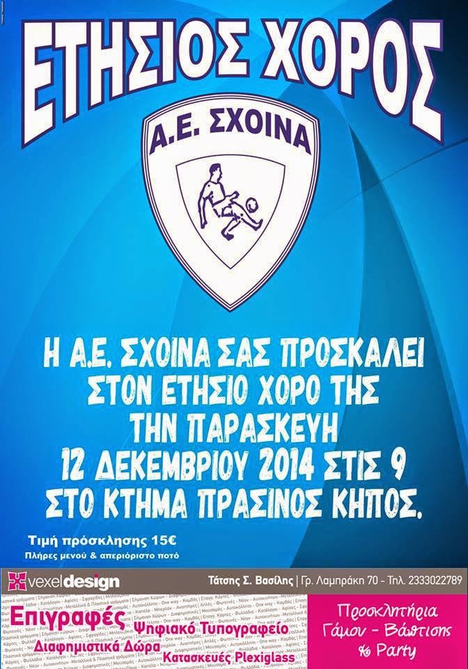 ΑΘΛΗΤΙΚΑ 11 Δεκεμβρίου, 2014 posted by admin Share Ο ετήσιος χορός της Α.Ε. Σχοινά στον ΠΡΑΣΙΝΟ ΚΗΠΟ στις 12 Δεκεμβρίου Η Α.Ε. Σχοινά σας προσκαλεί στον ετήσιο χορό της ομάδας την Παρασκευή 12 Δεκεμβρίου στις 21:00 στο Κτήμα ΠΡΑΣΙΝΟΣ ΚΗΠΟΣ στην Αλεξάνδρεια. Η τιμή πρόσκλησης είναι 15 ευρώ και περιλαμβάνει υπερπλήρες μενού και απεριόριστο ποτό. Αφήστε μια απάντηση Ακύρωση απάντησηςΗ ηλ. διεύθυνση σας δεν δημοσιεύεται. Τα υποχρεωτικά πεδία σημειώνονται με *Σχόλιο * Όνομα Email Ιστότοπος Αποθήκευσε το όνομά μου, email, και τον ιστότοπο μου σε αυτόν τον πλοηγό για την επόμενη φορά που θα σχολιάσω.