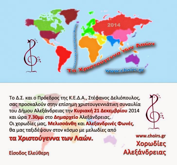 Την Κυριακή 21 Δεκεμβρίου, στις 7.30 μμ, στο Δημαρχείο της Αλεξάνδρειας, θα… πραγματοποιηθεί η επίσημη Χριστουγεννιάτικη Συναυλία του Δήμου Αλεξάνδρειας με τις χορωδίες του Δήμου και διοργάνωση της ΚΕΔΑ.