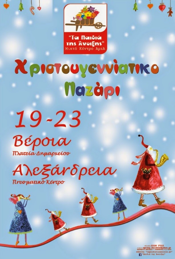 O Φιλανθρωπικός μη Κερδοσκοπικός Σύλλογος Γονέων και Κηδεμόνων ΑμεΑ Ν.Ημαθίας, το Μικτό Κέντρο Διημέρευσης – Ημερήσιας Φροντίδας, Απασχόλησης και Κατάρτισης ΑμεΑ Ν. Ημαθίας «Τα Παιδιά της Άνοιξης» και το Ε.Ε.Ε.Ε.Κ. Αλεξάνδρειας, σας ενημερώνουν ότι όπως κάθε χρόνο έτσι και φέτος, θα πραγματοποιήσουν τις χριστουγεννιάτικες εκθέσεις τους!