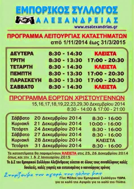 Μέχρι τις 16:00 θα είναι ανοιχτή η αγορά της Αλεξάνδρειας σήμερα Κυριακή 21 Δεκεμβρίου ενώ τα σούπερ μάρκετ θα παραμείνουν ανοιχτά μέχρι τις 20:00.