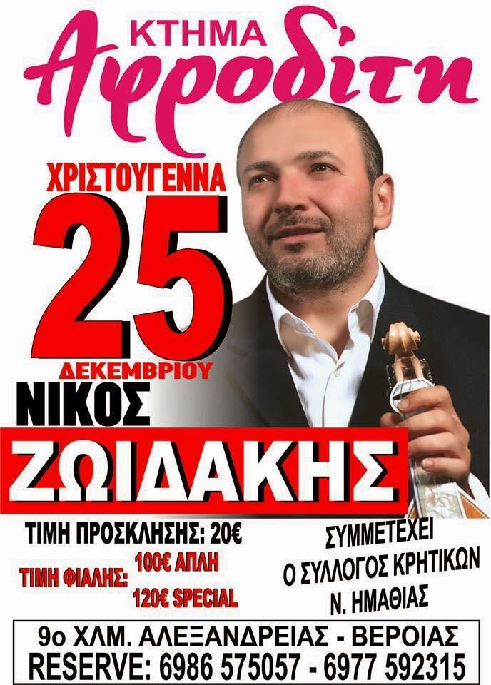 ΜΟΥΣΙΚΗ 22 Δεκεμβρίου, 2014 posted by admin Share Ο Νίκος Ζωιδάκης τα Χριστούγεννα στο Κτήμα ΑΦΡΟΔΙΤΗ Τον Νίκο Ζωιδάκη υποδέχεται ανήμερα των Χριστουγέννων το Κτήμα ΑΦΡΟΔΙΤΗ στο Καλοχώρι Ημαθίας. Η τιμή πρόσκλησης είναι 20 ευρώ. Τιμή φιάλης 100 ευρώ (απλή) και 120 ευρώ (special). Συμμετέχει ο Σύλλογος Κρητικών Ημαθίας. Αφήστε μια απάντηση Ακύρωση απάντησηςΗ ηλ. διεύθυνση σας δεν δημοσιεύεται. Τα υποχρεωτικά πεδία σημειώνονται με *Σχόλιο * Όνομα Email Ιστότοπος Αποθήκευσε το όνομά μου, email, και τον ιστότοπο μου σε αυτόν τον πλοηγό για την επόμενη φορά που θα σχολιάσω.