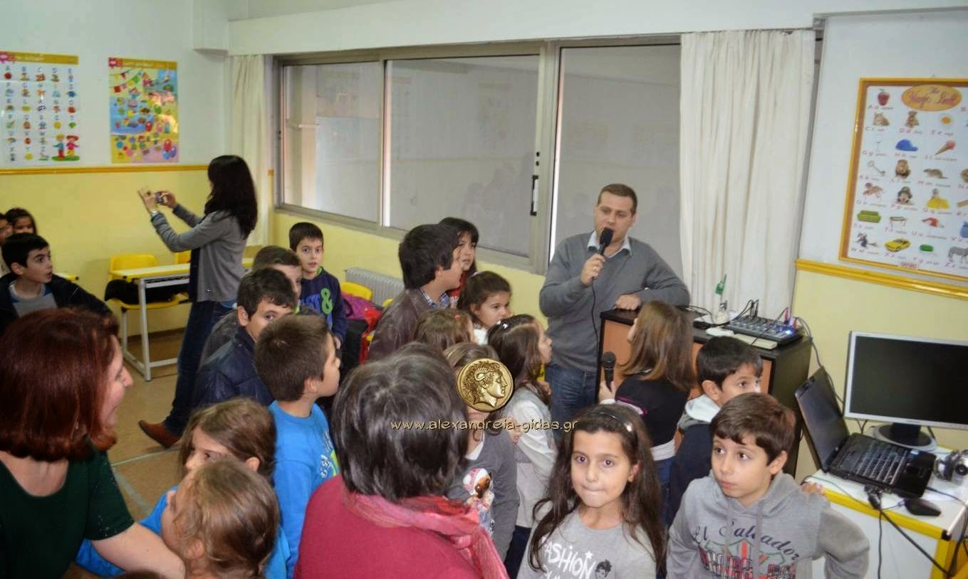 Οι μικροί μαθητές του σχολείου τον υποδέχτηκαν με χαρά και ενθουσιασμό και δέχτηκαν τα δώρα των εορτών.