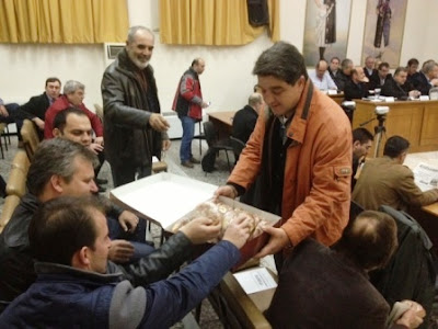 | Ο Απόστολος Ρεσινιώτης μοιράζει την βασιλόπιτα στους προέδρους των κοινοτήτων |