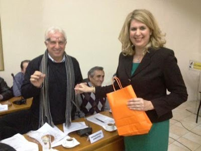 | Ο πρόεδρος της ΚΕΔΑ Δημήτρης Παπαδόπουλος παραλαμβάνει το δώρο από την Όλγα Μοσχοπούλου |
