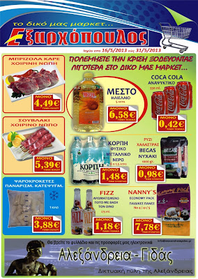 EXARXOPOULOSBANNERaΚυκλοφόρησε το νέο φυλλάδιο των τοπικών Σούπερ Μάρκετ Εξαρχόπουλος. Το φυλλάδιο το διαβάζετε σε ηλεκτρονική μορφή από το Αλεξάνδρεια-Γιδάς καθημερινά. Το νέο φυλλάδιο ισχύει μέχρι τις 31 Μαΐου όπως και η επιταγή της έκπτωσης των 5 ευρώ στα ψώνια σας από τα Σούπερ Μάρκετ Εξαρχόπουλος (δείτε λεπτομέρειες πατώντας ΕΔΩ).