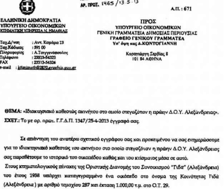 Ο βουλευτής της Ν.Δ. του νομού μας Απόστολος Βεσυρόπουλος γνωρίζοντας καλά το κτίριο της Εφορίας της Αλεξάνδρειας, αναζήτησε το ιδιοκτησιακό καθεστώς του κτιρίου της πρώην ΔΟΥ στη Γενική Γραμματεία Δημόσιας Περιουσάς από όπου του κοινοποιήθηκε πως το κτίριο ανήκει στον δήμο Αλεξάνδρειας. Γνωρίζοντας πως τόσο η διοίκηση του ΙΚΑ όσο και του ΕΟΠΥΥ ήταν διατιθεμένοι να αφήσουν τα υποκαταστήματά χωρίς να τα υποβαθμίσουν σε γραφεία σε πόλεις όπου τα κτίρια θα μπορούσαν να παραχωρηθούν δωρέαν, επικοινώνησε με τις δύο υπηρεσίες ενημερώνοντας τους για την κατάσταση και το κτίριο της πρώην Εφορίας στην Αλεξάνδρεια.