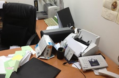 έσπασαν το φαξ και άλλα αντικείμενα του γραφείου ενώ προς το παρόν καταγράφεται η κλοπή ψηφιακής φωτογραφικής μηχανής, εξωτερικού σκληρού δίσκου και ασύρματου τηλεφώνου.