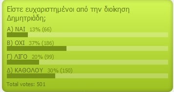 Τρίτη σήμερα και όπως ανακοινώσαμε από χτες, θα παρουσιάσουμε το αποτέλεσμα της 2ης ψηφοφορίας της Δικτυακής μας Πύλης. Το δεύτερο ερώτημα που…θέσαμε πριν τις διακοπές είχε να κάνει με το αν είστε ευχαριστημένοι από την διοίκηση του νυν δημάρχου Αλεξάνδρειας Φώτη Δημητριάδη.