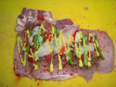 Τηγανιά χοιρινή μαριναρισμένη με μαρινάτα ρίγανης, πιπεριές, κρεμμυδάκι και ελαιόλαδο