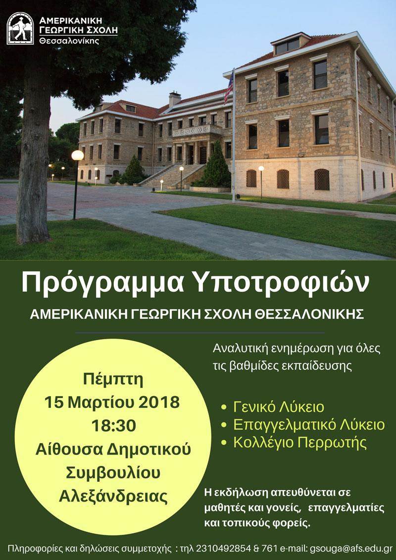Το «Πρόγραμμα Υποτροφιών» της Αμερικανικής Γεωργικής Σχολής καθώς και «Αναλυτική ενημέρωση για τα Δευτεροβάθμια και Τριτοβάθμια εκπαιδευτικά προγράμματα», θα βρεθούν στο επίκεντρο ενημερωτικής εκδήλωσης, η οποία θα πραγματοποιηθεί την Πέμπτη 15 Μαρτίου (18:30) στην αίθουσα Δημοτικού Συμβουλίου Αλεξάνδρειας Ημαθίας. Απευθύνεται σε ενδιαφερόμενους μαθητές, γονείς αλλά και επαγγελματίες και φορείς του γεωτεχνικού κλάδου που επιθυμούν να ενημερωθούν για το ιστορικό αυτό εκπαιδευτικό ίδρυμα.