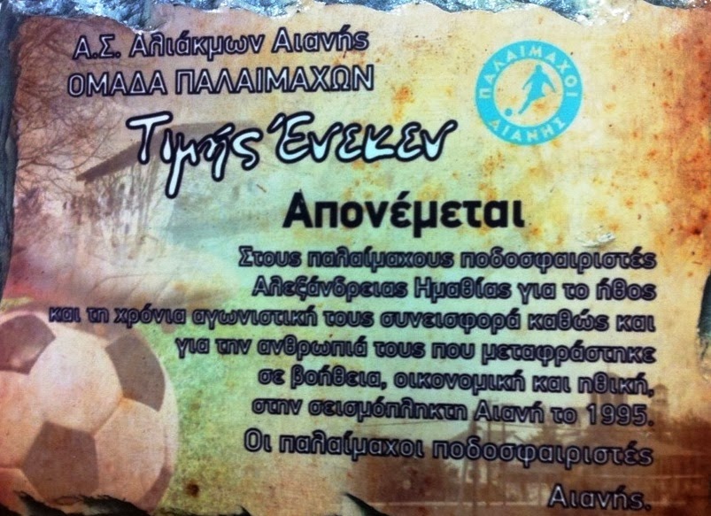 Το 1995 στον σεισμό που είχε πλήξει την Αιανή, ο Σύλλογος Παλαιμάχων Αλεξάνδρειας είχε ανταποκριθεί άμεσα και είχε προσφέρει την βοήθειά του στο χωριό της Κοζάνης. Οι Παλαίμαχοι της Αιανής δεν το ξέχασαν και το εκδήλωσαν με την πλακέτα που βλέπετε στην εικόνα: