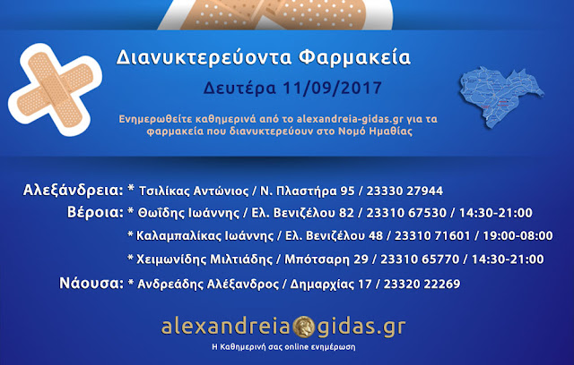 ΤΟΠΙΚΑ 11 Σεπτεμβρίου, 2017 posted by admin Share Εφημερεύοντα – διανυκτερεύοντα φαρμακεία Ημαθίας Δευτέρα 11 Σεπτεμβρίου Αλεξάνδρεια: Αφήστε μια απάντηση Ακύρωση απάντησηςΗ ηλ. διεύθυνση σας δεν δημοσιεύεται. Τα υποχρεωτικά πεδία σημειώνονται με *Σχόλιο * Όνομα Email Ιστότοπος Αποθήκευσε το όνομά μου, email, και τον ιστότοπο μου σε αυτόν τον πλοηγό για την επόμενη φορά που θα σχολιάσω.