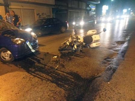 Τροχαίο ατύχημα σημειώθηκε πριν από λίγο (21:00) στην Αλεξάνδρεια. Ι.Χ. επιβατικό αυτοκίνητο το οποίο έβγαινε από την οδό Βιζυηνού στην Ελ. Βενιζέλου, εμβόλισε αστυνομική μηχανή ρίχνοντας τον αστυνομικό στο έδαφος και τραυματίζοντάς τον.Οι πρώτες πληροφορίες αναφέρουν πως ο αστυνομικός τραυματίστηκε ελαφρά και μεταφέρθηκε άμεσα στο Κέντρο Υγείας Αλεξάνδρειας.