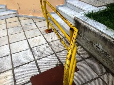 Περνώντας χτες από το 1ο Νηπιαγωγείο Αλεξάνδρειας διαπιστώσαμε πως η προστατευτική κίτρινη μπάρα η οποία προστατεύει τα παιδιά έλειπε από την είσοδο. Παρατηρώντας καλύτερα την είδαμε στον εσωτερικό χώρο του Νηπιαγωγείου. Προφανώς με το έργο της ανάπλασης, όταν περνούσαν τα πλακάκια η μπάρα αφαιρέθηκε αλλά ποτέ δεν τοποθετήθηκε πίσω στη θέση της μένοντας στην αυλή του Νηπιαγωγείου.