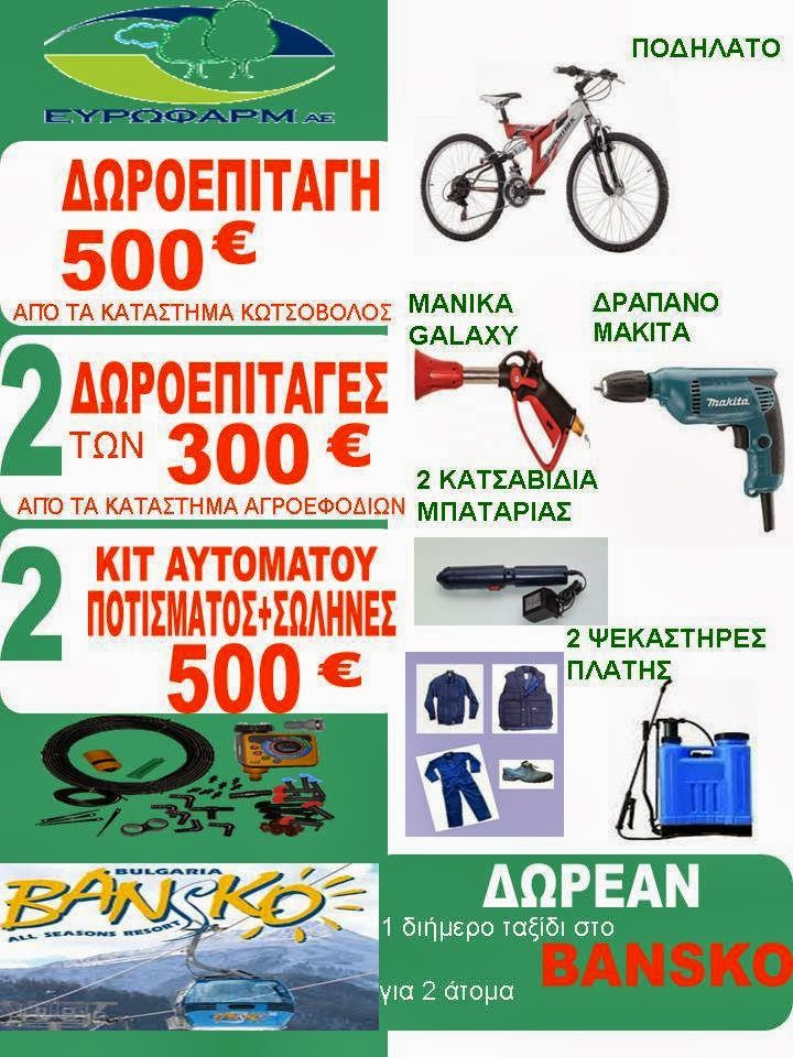 20 χρόνια δυναμικής παρουσίας στον αγροτικό χώρο συμπληρώνει φέτος η ΕΥΡΩΦΑΡΜ ΑΕ και γιορτάζει προσφέροντας 20 δώρα συνολικής αξίας 10.000€ . Η κλήρωση θα διεξαχθεί στην έδρα της ΕΥΡΩΦΑΡΜ ΑΕ, στην Αλεξάνδρεια Ημαθίας, στις 20 Δεκεμβρίου 2013 παρουσία δικηγόρου.Δικαίωμα συμμετοχής στην κλήρωση έχουν όλοι .