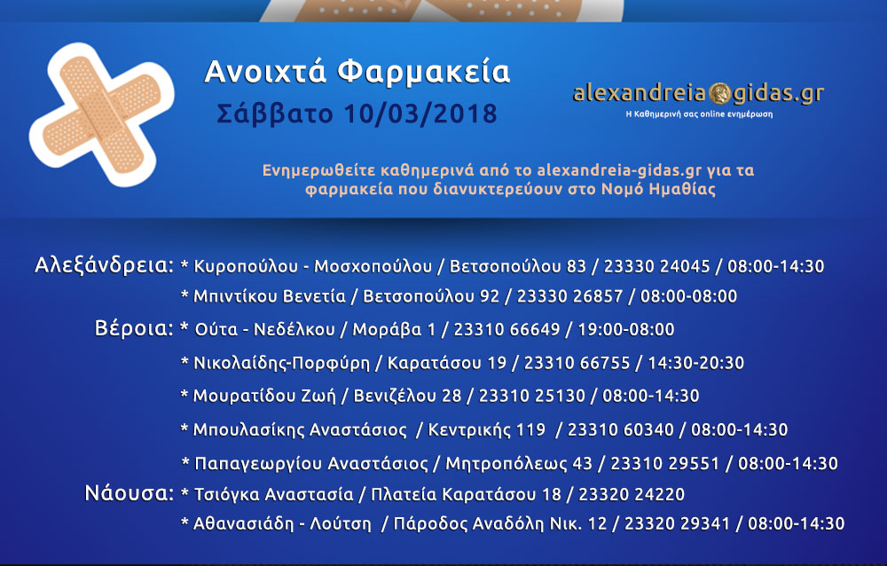 ΤΟΠΙΚΑ 10 Μαρτίου, 2018 posted by admin Share Ανοιχτά φαρμακεία Ημαθίας Σάββατο 10 Μαρτίου Αλεξάνδρεια: Αφήστε μια απάντηση Ακύρωση απάντησηςΗ ηλ. διεύθυνση σας δεν δημοσιεύεται. Τα υποχρεωτικά πεδία σημειώνονται με *Σχόλιο * Όνομα Email Ιστότοπος Αποθήκευσε το όνομά μου, email, και τον ιστότοπο μου σε αυτόν τον πλοηγό για την επόμενη φορά που θα σχολιάσω.