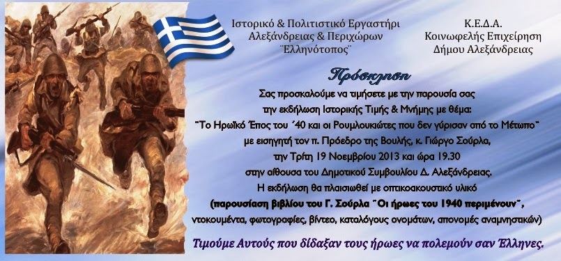 Το Ιστορικό και Πολιτιστικό Εργαστήρι Αλεξάνδρειας και Περιχώρων “Ελληνότοπος” και η Κοινωφελής Επιχείρηση του δήμου Αλεξάνδρειας σας προσκαλούν να τιμήσετε την εκδήλωση Ιστορικής Τιμής και Μνήμης με θέμα: “Το Ηρωικό Έπος του ’40 και οι Ρουμλουκιώτες που δεν γύρισαν από το Μέτωπο” με εισηγητή τον π. Πρόεδρο της Βουλής, κ. Γιώργο Σούρλα, την Τρίτη 19 Νοεμβρίου 2013 και ώρα 19:30 στην αίθουσα του δημοτικού συμβουλίου του δήμου Αλεξάνδρειας. Η εκδήλωση θα πλαισιωθεί με οπτικοακουστικό υλικό (παρουσίαση βιβλίου του Γ. Σούρλα “Οι ήρωες του 1940 περιμένουν”, ντοκουμέντα, φωτογραφίες, βίντεο, καταλόγους ονομάτων, απονομένες αναμνηστικών).