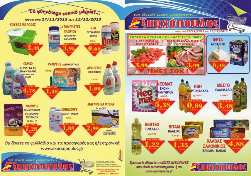 Τα τοπικά Σούπερ Μάρκετ ΕΞΑΡΧΟΠΟΥΛΟΣ σε συνεργασία με το Αλεξάνδρεια-Γιδάς σας παρουσιάζουν 2 φορές το μήνα το φυλλάδιο προσφορών του καταστήματος. Διαβάστε τις νέες προσφορές οι οποίες ισχύουν από 27 Νοεμβρίου μέχρι τις 15 Δεκεμβρίου:
