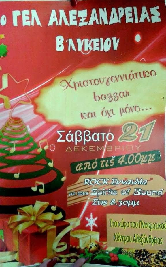 Χριστουγεννιάτικο BAZAAR με live μουσική διοργανώνουν οι μαθητές/τριες της Β΄τάξης του 1ου Γενικού Λυκείου Αλεξάνδρειας και σας προσκαλούν να θαυμάσετε δημιουργίες που κατασκεύασαν οι ίδιοι με πολύ μεράκι και φαντασία!