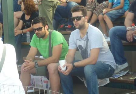 | Ο συνεργάτης του Ράδιο Αλεξάνδρεια Αργύρης Τσιγγενόπουλος με φιλάθλους του Μακροχωρίου |