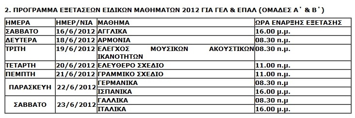 2. ΠΡΟΓΡΑΜΜΑ ΕΞΕΤΑΣΕΩΝ ΕΙΔΙΚΩΝ ΜΑΘΗΜΑΤΩΝ 2012 ΓΙΑ ΓΕΛ & ΕΠΑΛ (ΟΜΑΔΕΣ Α΄ & Β΄)