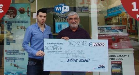 Στα κεντρικά καταστήματα της Wind γινόταν στην διάρκεια του Μαΐου κληρώσεις για τους νέους συνδρομητές της εταιρίας κινητής τηλεφωνίας σε όλη την Ελλάδα. Η μία εκ των επιταγών των 1.000 ευρώ κληρώθηκε στο κατάστημα της Αλεξάνδρειας. Μεγάλος τυχερός ο Στέλιος Παπαγερίδης που παρέλαβε την επιταγή από το κατάστημα. Στην φωτογραφία ο τυχερός με τον ιδιοκτήτη του καταστήματος Μάριο Θεοχάρη.