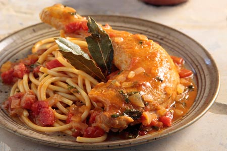 Ξαναβάζουμε τα κομμάτια του κοτόπουλου στην κατσαρόλα, ρίχνουμε τις ντομάτες και το φύλλο δάφνης, σκεπάζουμε την κατσαρόλα και μαγειρεύουμε για 20-30 λεπτά σε χαμηλή φωτιά. Τότε, βγάζουμε από την κατσαρόλα τα στήθη που θα έχουν ήδη μαλακώσει καλά, τα βάζουμε σε ένα μεγάλο πιάτο και τα διατηρούμε ζεστά (αν τα αφήσουμε παραπάνω στην κατσαρόλα, θα στεγνώσουν και θα σκληρύνουν). Συνεχίζουμε να μαγειρεύουμε τα μπούτια για άλλα περίπου 30 λεπτά, πάντα σε χαμηλή φωτιά και με κλειστή κατσαρόλα, μέχρι να μαλακώσουν και το ψαχνό να ξεκολλά εύκολα από το κόκαλο.