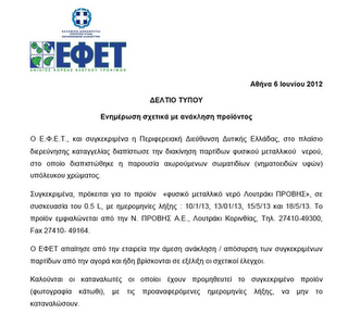 ΤΟΠΙΚΑ 7 Ιουνίου, 2012 posted by admin Share ΠΡΟΣΟΧΗ! ΑΝΑΚΛΗΣΗ ΦΥΣΙΚΟΥ ΜΕΤΑΛΛΙΚΟΥ ΝΕΡΟΥ Σύμφωνα με σχετικό δελτίο τύπου, ο ΕΦΕΤ απαίτησε ανάκληση / απόσυρση του μεταλλικού νερού Λουτράκι ΠΡΟΒΗΣ. Κάντε κλικ πάνω στην εικόνα που ακολουθεί, για λεπτομέρειες και κυρίως για να μάθετε ποιες είναι οι χαλασμένες παρτίδες: meacolpa Αφήστε μια απάντηση Ακύρωση απάντησηςΗ ηλ. διεύθυνση σας δεν δημοσιεύεται. Τα υποχρεωτικά πεδία σημειώνονται με *Σχόλιο * Όνομα Email Ιστότοπος Αποθήκευσε το όνομά μου, email, και τον ιστότοπο μου σε αυτόν τον πλοηγό για την επόμενη φορά που θα σχολιάσω.