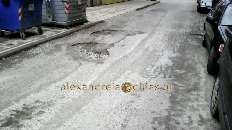 Ένα από τα πολλά επικίνδυνα σημεία στους δρόμους της Αλεξάνδρειας είναι η λακκούβα στην Βιζυηνού μπροστά στο ύψος του σούπερ μάρκετ της οικογένειας Τρεύλα.