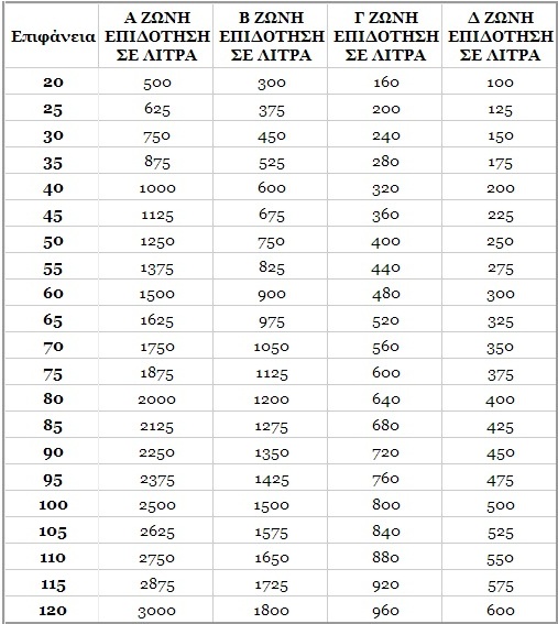 Επίσης, ο μέγιστος αριθμός τετραγωνικών που θα επιδοτούνται θα είναι τα 120 τετραγωνικά. Πρακτικά όλα αυτά σημαίνουν τα εξής: Ο αριθμός των λίτρων για τα οποία θα μας επιδοτούν, θα εξαρτάται από τα τετραγωνικά της κύριας κατοικίας μας και τη ζώνη που βρίσκεται το ακίνητό μας. Ο πίνακας θα βοηθήσει:
