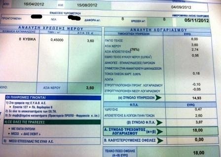 Είναι αλήθεια πως ένας λογαριασμός νερού 4μήνου στη Θεσσαλονίκη αντιστοιχεί σε χρήματα στο μισό του λογαριασμού νερού 2μήνου στην Αλεξάνδρεια; Δύο λογαριασμούς νερού λάβαμε με mail σήμερα το πρωί από φίλο αναγνώστη. Ο ένας Θεσσαλονίκης και ο άλλος Αλεξάνδρειας. Συγκρίνετε τις τιμές των δύο λογαριασμών, δείτε την κατανάλωση σε κυβικά και κυρίως το διάστημα στο οποίο αναφέρονται οι συγκεκριμένοι λογαριασμοί. Δείτε τις δύο εικόνες: