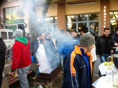 Η αλήθεια είναι πως δεν είναι μόνα τα φωτάκια και οι στολισμοί των σπιτιών και καταστημάτων που λάμπουν με την απουσία τους φέτος στην Αλεξάνδρεια, είναι και οι γουρουνοχαρές που παραμονές Χριστουγέννων σε προηγούμενα χρόνια συναντούσαμε σε μεγάλη συχνότητα ειδικά στην Βετσοπούλου. Φέτος ήταν λίγα τα καταστήματα που παραμονή Χριστουγέννων έβγαλαν ψησταριές και κέρασαν τον κόσμο νοστιμιές και κρασί. Ένα από αυτά ήταν και το καφέ – μπαρ “Traffic” από όπου και σας παρουσιάζουμε τις εικόνες που βγάλαμε σήμερα το μεσημέρι: